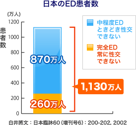 1998年におこなわれた調査によると、EDで悩む日本人男性(完全型ED・中等度ED)は、1,130万人と1,000万人を超えており、50代では約2人に1人がEDで悩んでいるという結果が出ています。